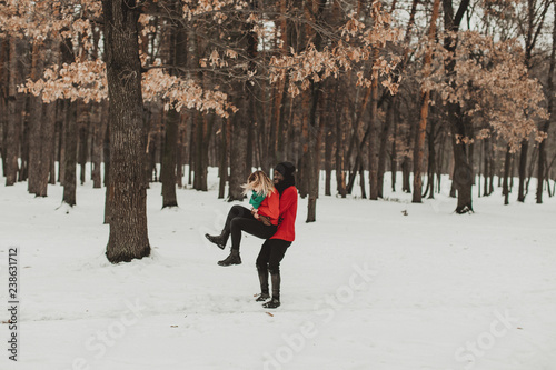 young couple in love walks through the winter forest and kiss