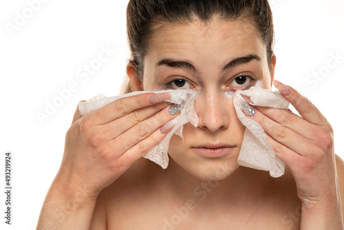 young woman cleans her face with wet wipes