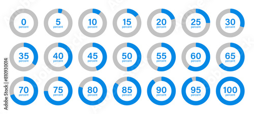 0 to 100 infographic loading circles set with percentage text for business data and analysis presentation use in blue color