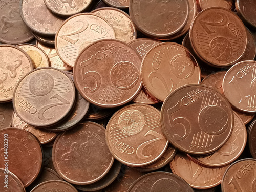 1, 2 and 5 euro cent coins texture background. Selective focus.
