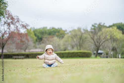 屋外の自然あふれる公園内で楽しそうに笑顔ではしゃぐ1歳の幼児