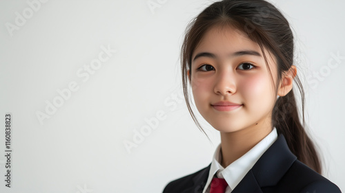 制服姿で白背景に撮影されたフレッシュな10代日本人女性のポートレート