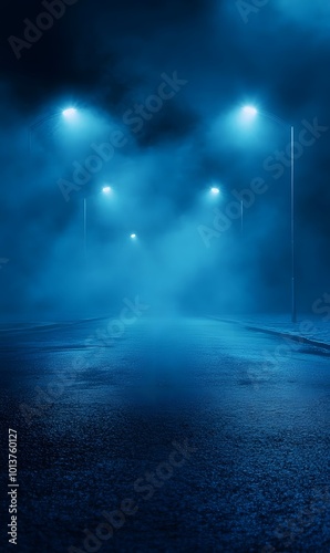 10. An abstract dark blue background depicting an empty street, where neon lights and spotlights create a striking contrast against the asphalt, with smoke rising from the ground for a mysterious