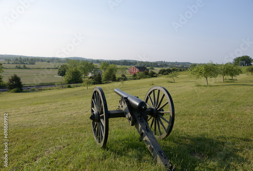 10 pounder Parrott riffled cast iron artillery piece model 1861 at Gettysburg. Battlefield in the background