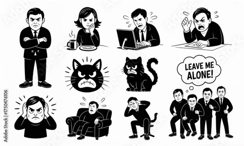 "10 Unique Vector Illustrations for National Grouch Day in Black Silhouette Sketch Style"