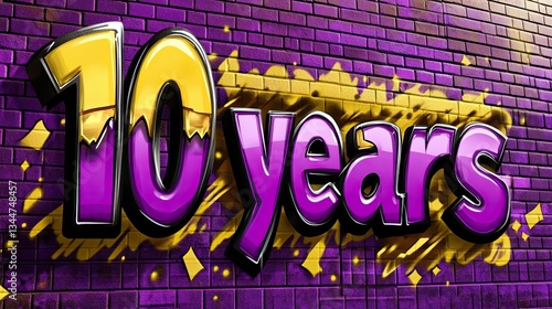 10 years anniversary graffiti-style artwork on a vibrant purple brick wall with yellow paint splashes. The bold, colorful typography conveys a sense of celebration and milestone achievement