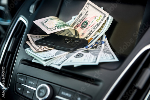 100 dollar bills with car key inside car. bribe or buy rent concept