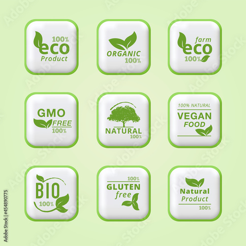 100% ECO Farm. Ecological leaves labels green icon. Pure organic fresh product label design. 3d icons. Bio, natural products, gmo free, vegan food. Concept web design, website page development. Set