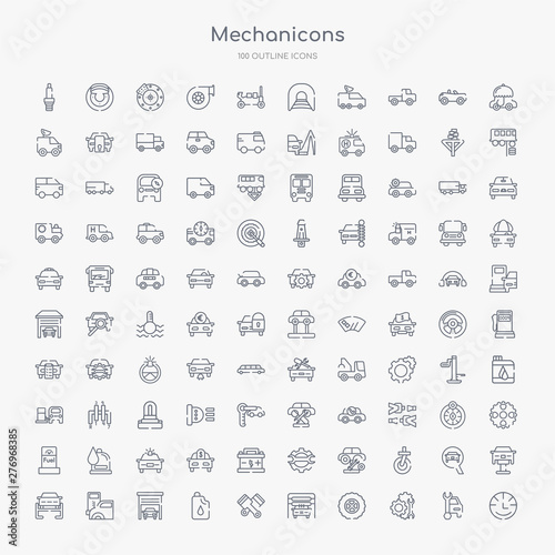 100 mechanicons outline icons set such as car speedometer, repair mechanism, car wheel, car wash machine, pistons cross, change oil, inside a garage, in a gas station