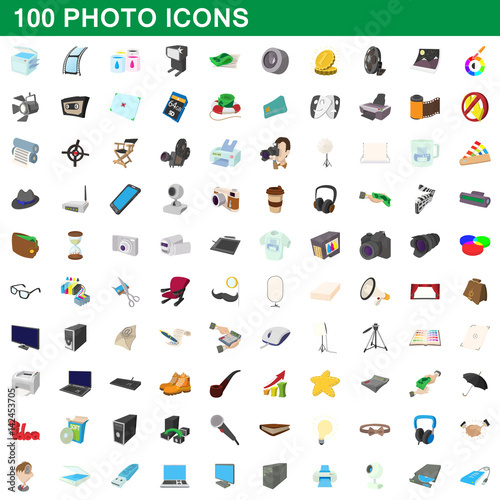 100 photo icons set, cartoon style