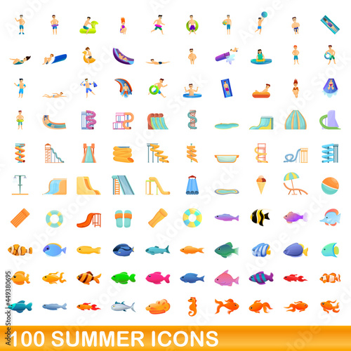 100 summer icons set. Cartoon illustration of 100 summer icons vector set isolated on white background