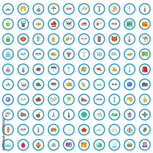 100 travel and landmarks icons set in cartoon style for any design vector illustration