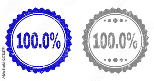 100.0% stamp seals with distress texture in blue and grey colors isolated on white background. Vector rubber overlay of 100.0% title inside round rosette. Stamp seals with grunge styles.