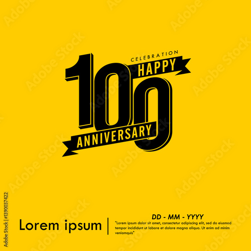 100th years anniversary celebration emblem. black logo isolated with ribbons on yellow background. vector illustration template design for web, flyers, poster, greeting card and invitation card