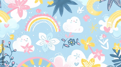 110. Beautifully designed seamless pattern featuring pastel-colored palms, rainbows, clouds, and flowers, ideal for creating lovely and whimsical designs for children's textiles and decor