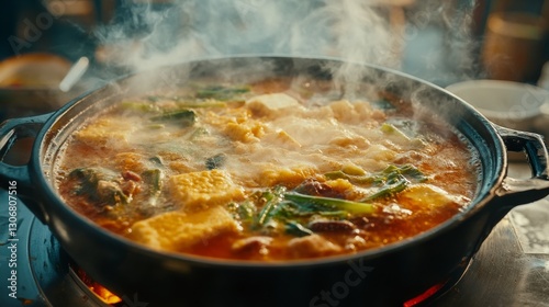 112.A detailed shot of a Chongqing-style hot pot meal, showcasing the rich, spicy broth simmering with fresh vegetables, meats, and tofu, set in a restaurant in the mountainous city of Chongqing,