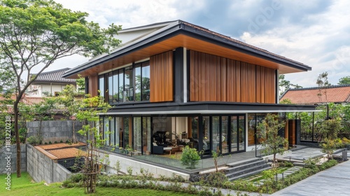 117.A contemporary home featuring a Korean Scandinavian design, with clean geometric lines, a sloped roof, and a neutral color palette, located on a quiet city street in Bogor.
