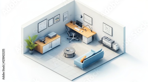11.A realistic isometric depiction of an office space featuring a minimalist desk setup, a sideboard with files and decor, and a lounge area with a sofa and coffee table.