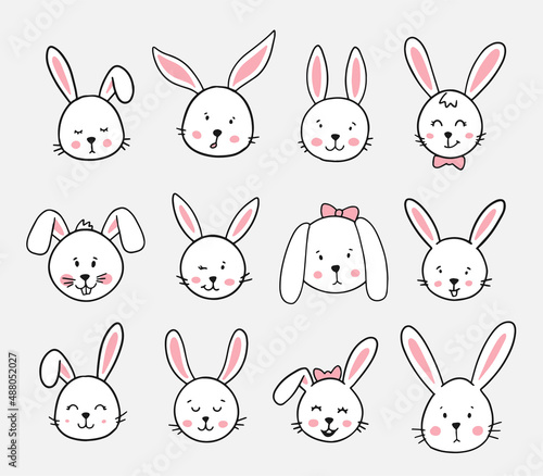 12 hand drawn rabbits for stickers, icons, prints, cards, labels, tags, easter decor, etc. Bunny, rabbit head, cartoon drawing, etc. EPS 10