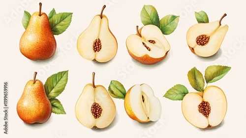12 realistic pear illustrations, including whole, halved, sliced, and with leaves, perfect for fresh fruit-themed designs.
