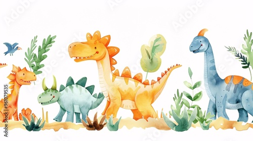 123. Delightful seamless border with different types of dinosaurs, each painted in soft watercolor, creating a whimsical and kid-friendly illustration