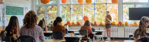 13 High school classroom with autumn decorations, students participating in a debate, Autumn Debate Class, Engaging Education
