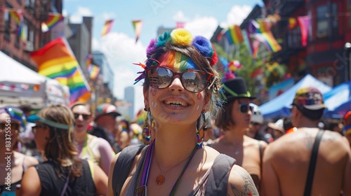 14. A lively street festival with vendors, performers, and attendees all celebrating Pride, with rainbow flags, face paint, and a joyous atmosphere of community