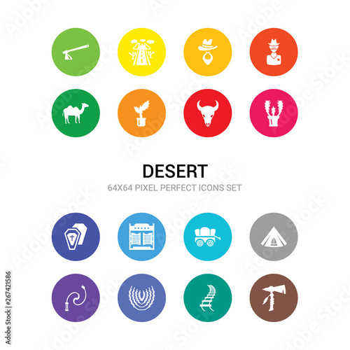 16 desert vector icons set included tomahawk, train rails, tumbleweed, whip, wigwam, wild west cart, wild west saloon, wooden coffin, barrel, bull skull, cactus icons