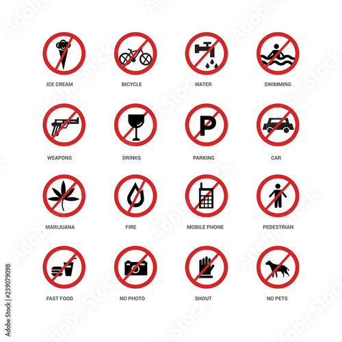16 icons related to No pets, Shout, photo, Fast food, Pedestrian, Ice cream, Weapons, Marijuana, Parking, undefined, undefined signs. Vector illustration isolated on white background.