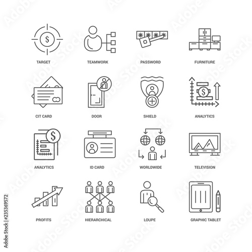 16 linear icons related to Graphic tablet, Door, Target, undefin