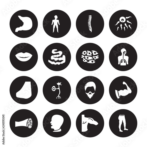 16 vector icon set : Stomach, Men Shoulder, Mouth Open, Muscle Fiber, Muscular arm, Leg, Smiling mouth showing teeth, Nose Side View, Skin Cells isolated on black background
