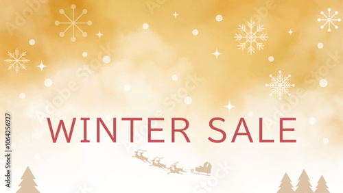 キラキラ輝く水彩ゴールドと雪の結晶のクリスマスの背景バナー素材 ベクターイラスト 16:9 ウインターセール サンタクロース 手描き