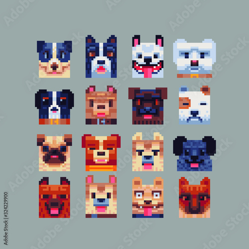 16Bit Dogs characters pixel art icons set, design for logo, sticker, web, logo shop, mobile app, isolated vector illustration. Dog head. Game assets 8-bit sprite.