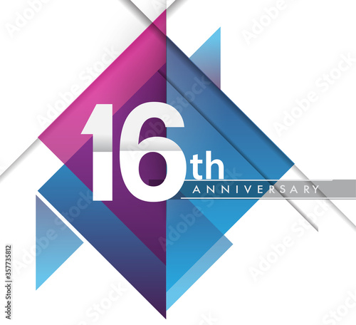 16th years anniversary logo with geometric, vector design birthday celebration isolated on white background.