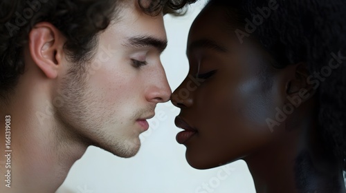 18. White man gently holding Black woman is face before a kiss