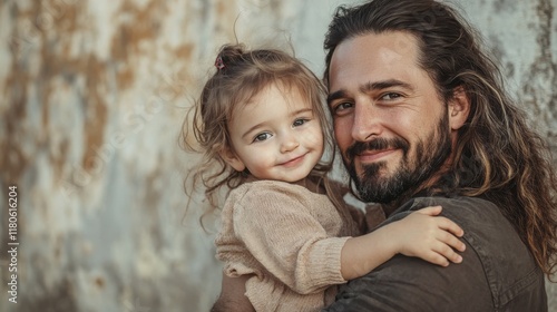 18.A candid portrait of a father with long hair holding his young daughter in front of a textured urban wall. The man’s relaxed smile and the child’s playful demeanor convey a sense of joy and
