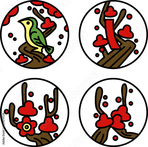 2月のカラーミニ円形花札アイコンセット