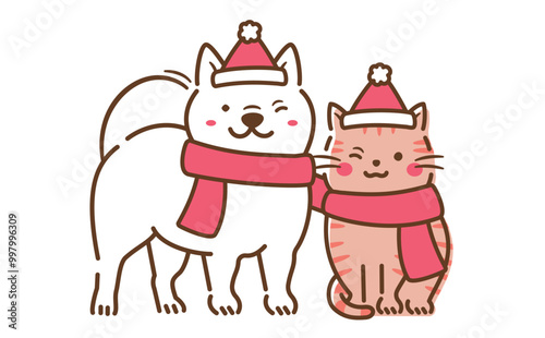 笑顔で笑う犬猫のおすわりしているかわいい全身のペットイラスト_冬、クリスマスパーティー中の2匹