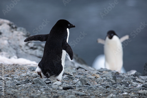 2 Adelie penguins approach each other with spread wings or arms as they want to hug each other as a reunion in Antartica