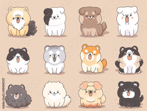 2. Adorable collection of pastel-colored dog characters with round bodies, showcasing a variety of feelings and poses, from happy and playful to sleepy and curious, drawn in a kawaii vector style on