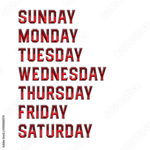 2 Color of Red 3D Illustration Text: Week days, Sunday till Saturday, Isolated Against the White Background.