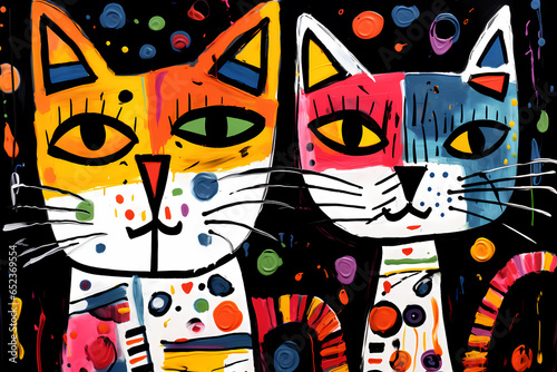 2 cute colorful cats in a naive abstract oil painting. Two cheerful pets in a simple drawing made by a child