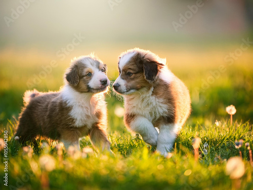 2 cute little brown and white puppies playing on green meadow in the evening sun
