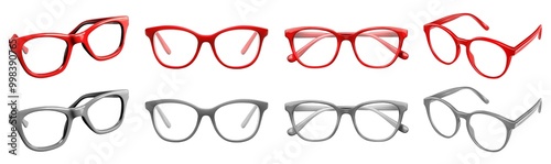 2 Set of red maroon grey gray rimmed frame spectacles specs eyeglasses eye glasses eyewear with semi transparent clear lens on cutout PNG. Many different angle. Mockup template for artwork design