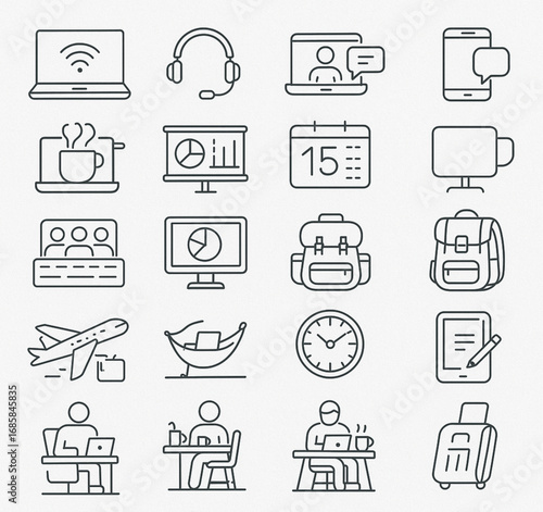 20 Minimal Line Icons Remote Work and Digital Nomad Vector Set | Laptop, Travel, Office, Communication, Productivity Symbols