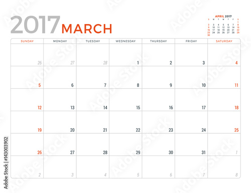 2017 Calendar Planner Vector Design Template. March. Week Starts Sunday