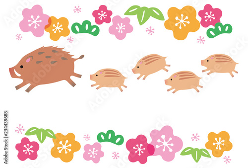 年賀状テンプレート ハガキ 2019年亥年 走る猪の親子と松竹梅 白 文字なし
