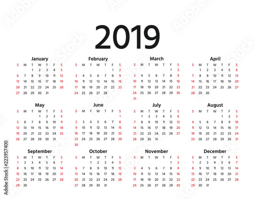 2019 Calendar. Vector. Week starts Sunday in minimal simple style. Stationery 2019 year horizontal template. Yearly calendar organizer for weeks. Landscape orientation, english.