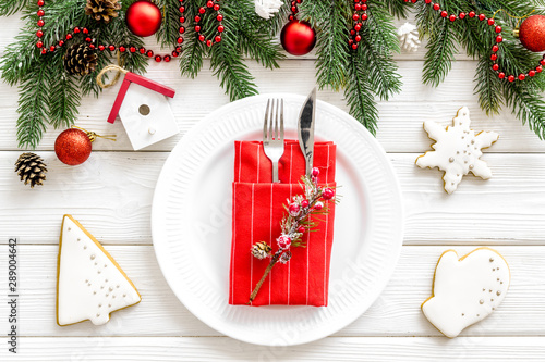 2020 year celebration with table setting, ginger cookies on white wooden background top view