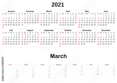 2021 annual calendar with white background.